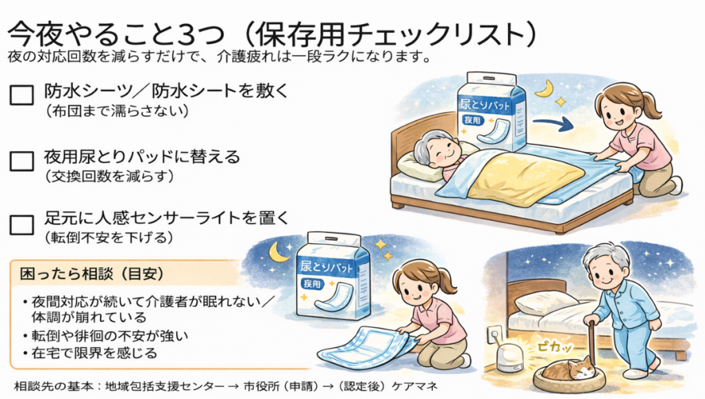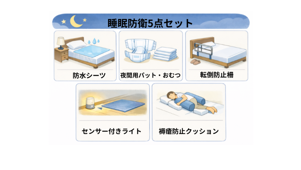 - まず揃えるのは 防水・吸収・交換短縮・足元灯・体位サポート(できる範囲でOK)