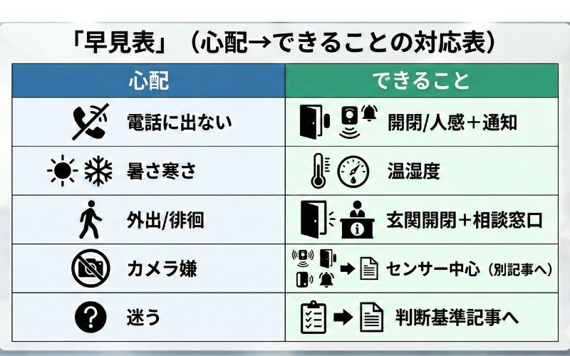 - まず決めるのは「何が心配か」1つ(転倒?徘徊?食事?体調?)